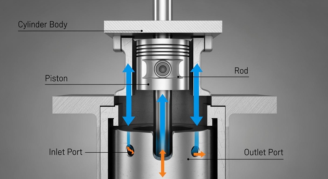 Observação: Cilindros de dupla ação são mais rápidos e potentes. Consomem menos energia e proporcionam melhor controle. Cilindros de ação simples são mais baratos e fáceis de manter, mas só se movem em uma direção.
